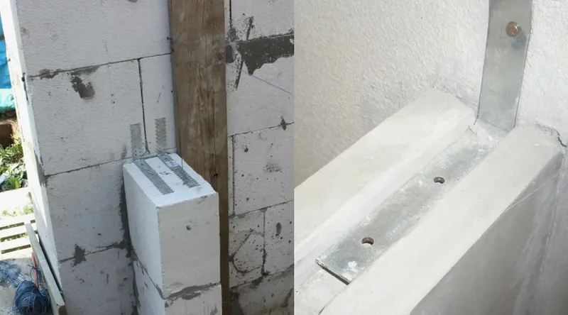 Варианты крепления прямыми подвесами и уголками из полосовой стали - Как вариант, применяют более дорогие специальные анкера, острые концы которых заделываются в стену сверлением, а гибкие замоноличиваются в швах между блоками перегородки - через один ряд. Когда вся конструкция будет готова, в полость примыкания заливается монтажная пена или ППУ клей, что использовался для кладки.