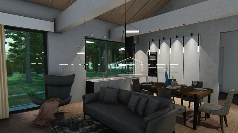 - В гостиной дома FH-90F FINestra имеется второй свет, формируемый за счёт высоты потолка 5,5 м и дополнительного фронтонного окна. Мансардных окон в базовом варианте проекта нет, но по желанию заказчика они могут быть добавлены. Внутри дома можно видеть две с виду мощные балки, которые, однако, не являются несущими. Они выполняют декоративную и практичную функцию – в них заложены электрические кабели, дающие возможность монтировать групповые светильники над обеденной и диванной зоной.