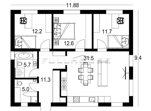 Размер дома FH-90F FINestra в плане составляет 11,88 х 9,4 м. Такие «некруглые» параметры обусловлены типоразмерами применяемых материалов, стремлением архитектора обеспечить их наиболее рациональный расход.