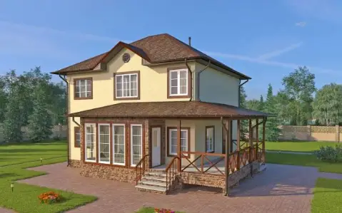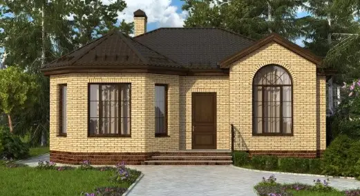 - Дом с эркером. Особенность строения - гостиная с эркером и многоуровневая крыша. Строение облицовано кирпичом и подходит для постоянного проживания. К задней части сооружения можно пристроить открытую веранду или беседку.