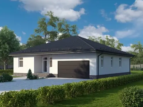 - Коттедж в европейском стиле с шатровой кровлей и гаражом. Две спальни + детская спрятаны в глубине коттеджа, а их окна выходят во двор. Большая гостиная совмещена с кухней. Внешняя отделка - фасадная теплоизоляционная штукатурка.