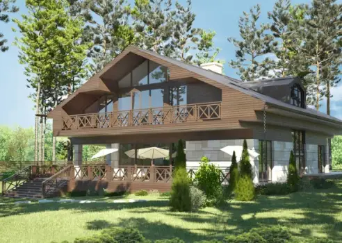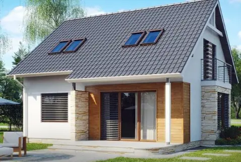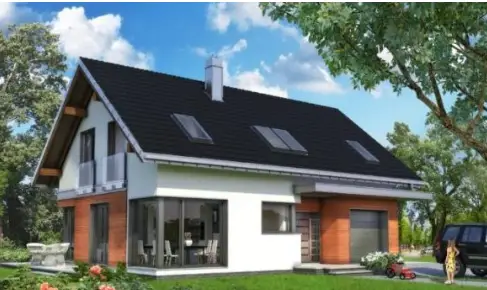 - Компактный дом с мансардой. Отличный выбор для небольшого участка. За счет мансарды общая площадь составляет около 120 м², а сметная стоимость строительства значительно ниже, чем у строения с полноценным вторым этажом. Утепленная кровля, небольшие балконы и узкие окна «в пол» придают сооружению лаконичность.