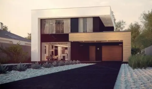 - Двухэтажный дом в стиле «хай-тек». Современный, функциональный и простой в исполнении коттедж с плоской крышей и гаражом. За счет второго этажа жилая площадь увеличивается в 2.5 раза.