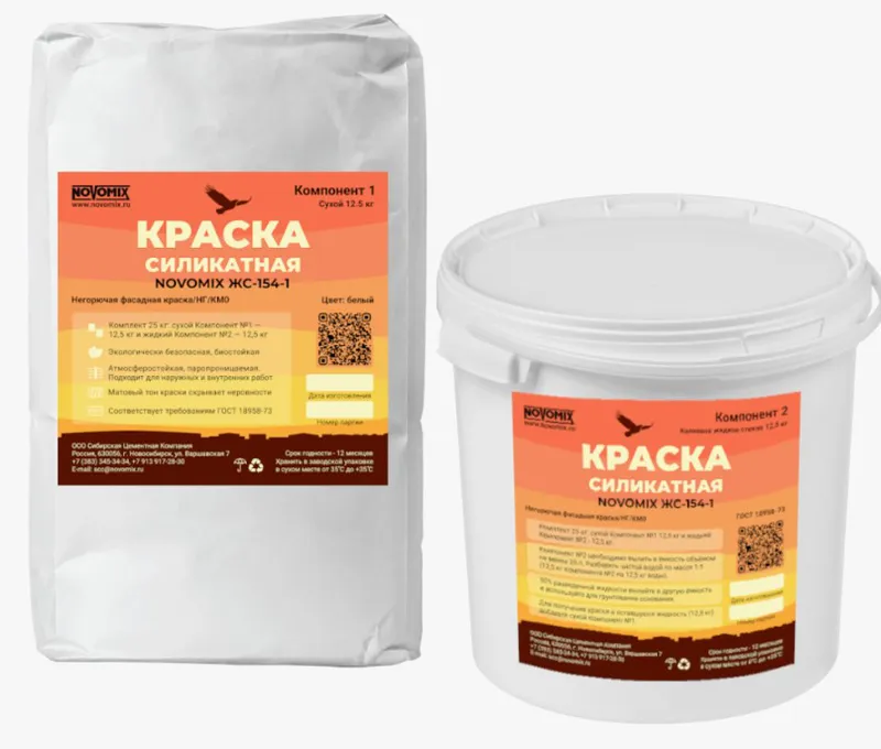 - Также в силикатных красках присутствует кремнезёмистый наполнитель в виде тонкомолотого трепела, диатомита или кварцевого песка. Составы на основе жидкого стекла поставляют в двух разных тарах – калийное стекло отдельно от сухой части, и смешивают их в пропорции 2:1 перед употреблением.