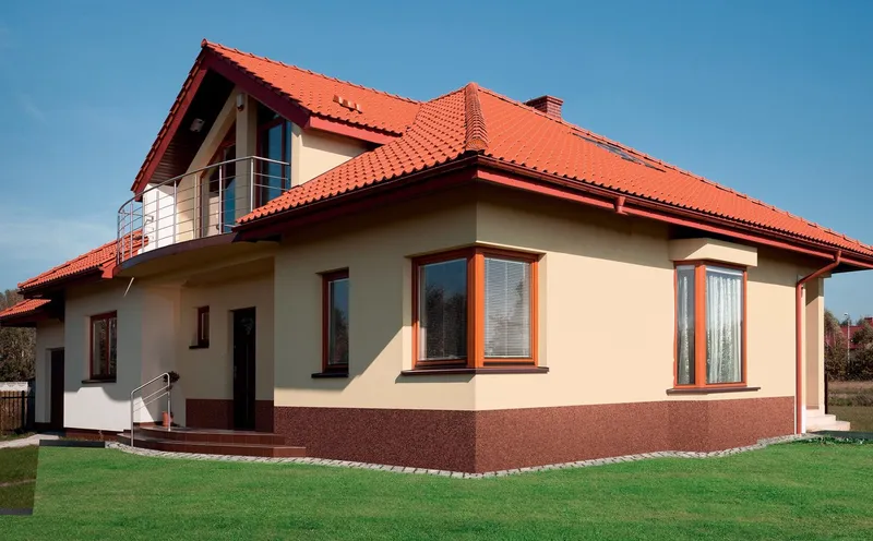 Варианты отделки фасада газобетонной плиткой и блоками с фаской - Чаще всего для внешней отделки стен используется штукатурка, потому что это и доступнее, и быстрее, и дешевле. Хотя штукатурки тоже бывают разными. Плотность любой штукатурки выше плотности газоблока, поэтому пар такое покрытие пропускает медленнее. Тут всё дело в толщине наносимых слоёв – если они тонкие, всего 2-3 мм, паробарьера не образуют.
