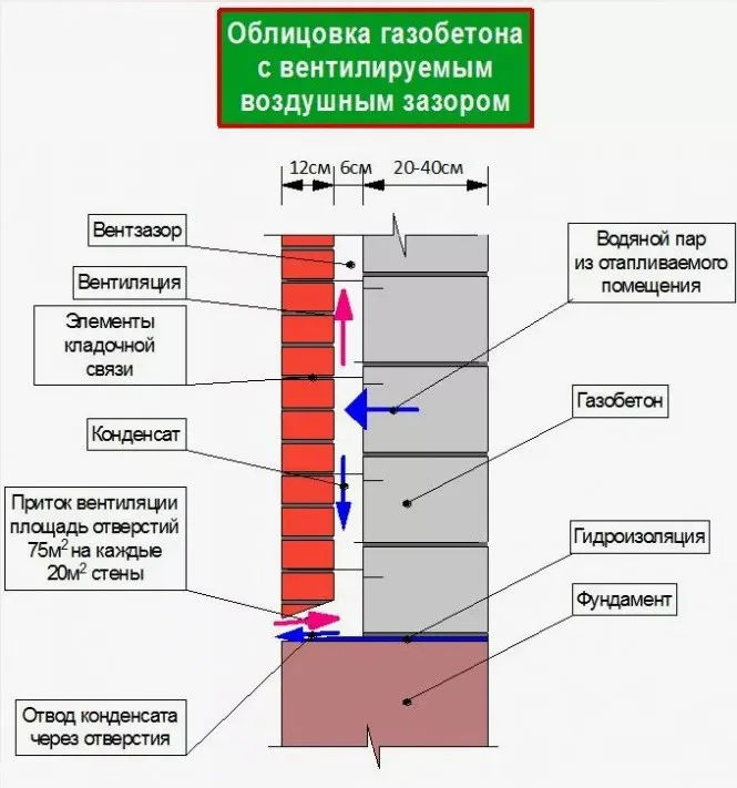 Схема газоблочной стены с кирпичной облицовкой - Для притока воздуха в нижнем ряду кирпичной облицовки оставляют незаполненные раствором вертикальные швы (продухи), а для удаления пара, который поднимается вверх – технологический зазор между последним рядом и карнизом. Отступ между основной и декоративной кладкой составляет не менее 40 мм, что должно учитываться при определении ширины фундаментных лент и ростверков.