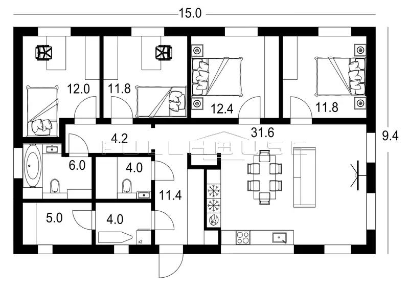 Модификацию проекта FOURex Full Villa отличает от 2х других вариантов планировок то, что в нем все 4 спальни изолированы от гостиной.