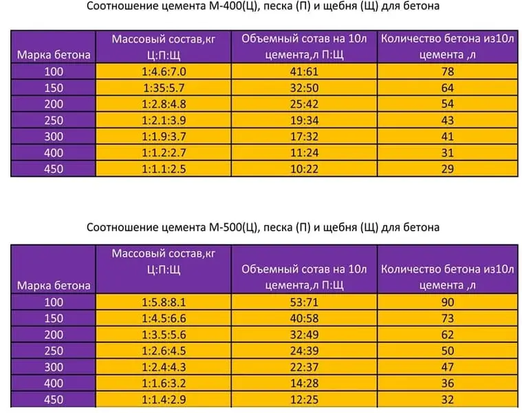 - Обычно для изготовления бетона используют цемент марки М400, но в данном случае лучше взять М500. Он не только придаст бетону нужные свойства, но ещё и расходоваться будет в меньшем количестве. Так, для изготовления бетона В22,5 (М300) на цементе М400 соблюдаются пропорции Ц:П:Щ 1/ 1,9/ 3,7, тогда как на цементе М500 это соотношение оставит 1/ 2,4/ 4,3. Песка и щебня кладётся больше – соответственно, цемента уйдёт меньше.