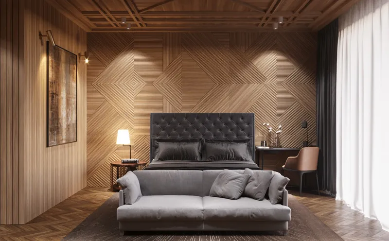 Идея отделки спальни в барнхаусе: «старая» кирпичная кладка в сочетании с ламинатом - Отличным отделочным материалом является ламинат, который для оформления стен сегодня используют едва ли не чаще, чем для пола. Для пола, кстати, подойдёт и паркетная доска, и обычная шпунтованная, но можно уложить линолеум с рисунком дерева или камня, использовать керамогранит с такими же фактурами или кварцвиниловую плитку. То есть неважно, какой именно применяется напольный материал - важно его лицевое оформление, обеспечивающее нужный эффект.