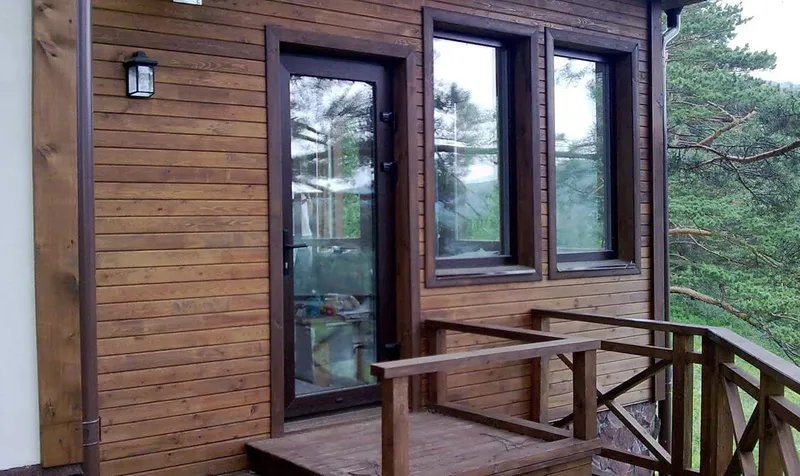 Ламинированные пластиковые окна и двери под дерево отлично вписываются в облик шале - То же самое касается фасадной отделки: чтобы стилизовать фасад или его часть под сруб, можно использовать вагонку «имитация бруса». Если нужно просто получить дощатое покрытие, можно использовать натуральную термообработанную доску планкен или композитную декинг. Современные технологии позволяют достоверно имитировать различные фактуры даже на пластике или металле, но наиболее достоверно они выглядят в фиброцементном исполнении.