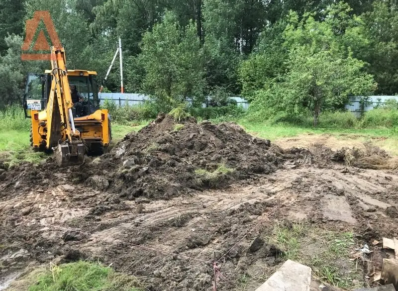 После того, как растительный слой грунта будет срезан, в пятне застройки выполняется планировка с устройством поперечных уклонов для отвода дождевых вод и уплотнением. Только после этого можно приступать к разбивке контуров траншей - их обозначению на территории участка. Разбивка ведётся сначала в горизонтальной плоскости, с закреплением на местности осей здания и намётки линий траншей в плане, а потом в горизонтальной плоскости – на требуемую глубину.