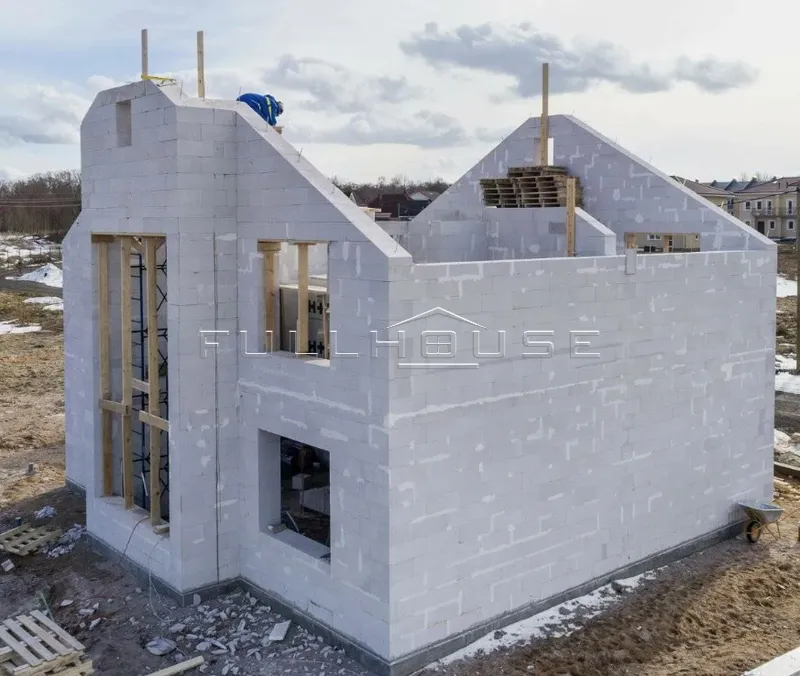 Строящийся дом из газоблока - Стремление снизить плотность обусловлено необходимостью получения высокоэффективного с точки зрения теплотехники материала, ведь теплопроводность прямо пропорциональна плотности, и снижается вместе с нею. А чтобы при этом сохранялась нужная прочность, сырьевая смесь за счёт добавок обогащается кальцием. В процессе автоклавирования он вступает в реакцию и кремнезёмом и образует новые, более прочные молекулярные связи.