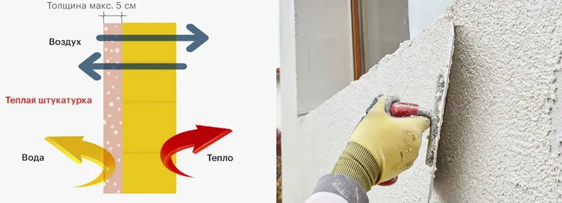 - Из адгезионных материалов хорошо работают только паропроницаемые штукатурки, которые можно наносить тонкими слоями в 2-3 мм (известковые, силикатные, силиконовые, акрилатные). Более толстыми слоями можно наносить только тёплые штукатурки на перлите - до 50 мм.