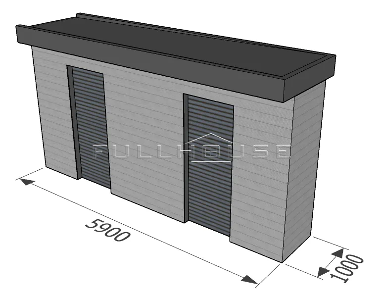 - Компактный с общими габаритами 5,9 х 1м разделен на 2 блока с равными размерами по 2,95 х 1м. Хозблок с такими размерами – это самое экономичное и рациональное решение с максимальным использованием полезной площади, т.к. нет транзитной зоны для прохода. Больше полезной площади используется именно в 2х отдельных блоках, нежели в одном без разделения. Проемы удобнее закрывать роллетами. И их я всегда проектирую по одной стороне, даже если комплекс автонавеса с хозблоком располагается отдельно от дома. В противном случае будет неудобная логистика автомобиль-хозблок и добавятся дорожки там, где они не нужны.