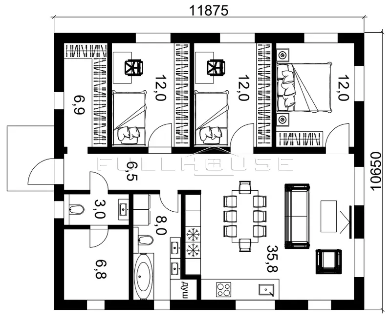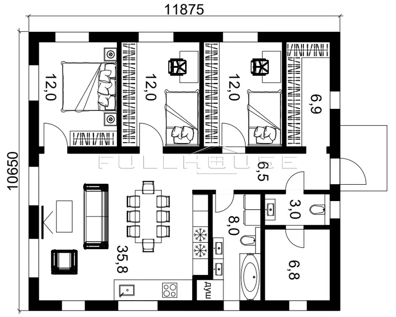 - Характеристики: площадь 103м²;   3 спальни;   1 этаж