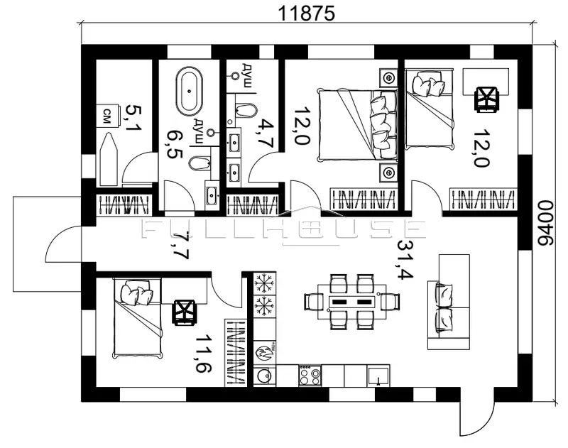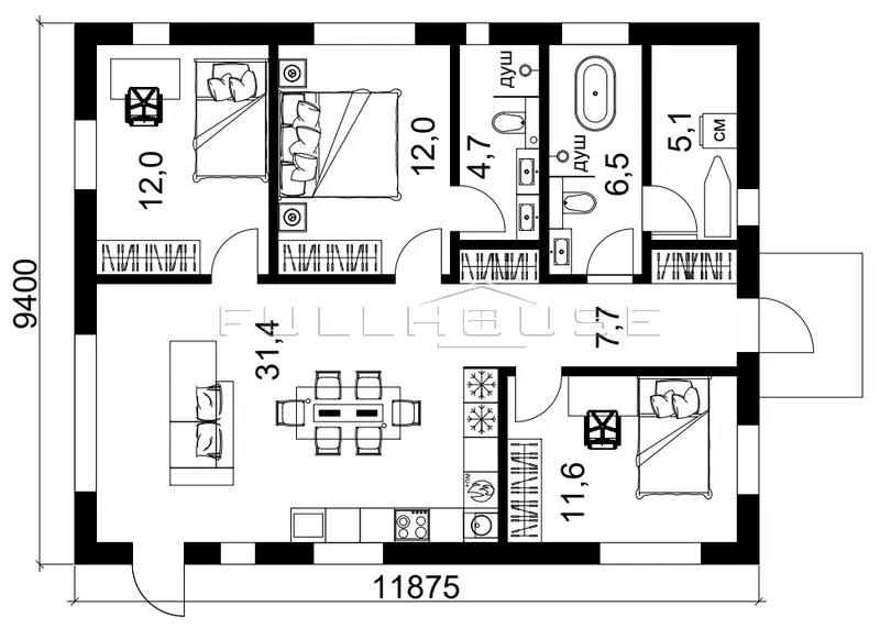 - Характеристики: площадь 90м²;   3 спальни;   1 этаж