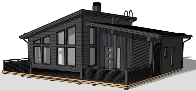 - Использование дерева в качестве основных строительных и отделочных материалов. Деревянный каркас дома смонтированный по скандинавской технологии, стропильные фермы на МЗП, покрытие террасы импрегнированной доской хвойных пород, на фасаде тонкопиленая доска с поднятым ворсом крашенная в заводских условиях.