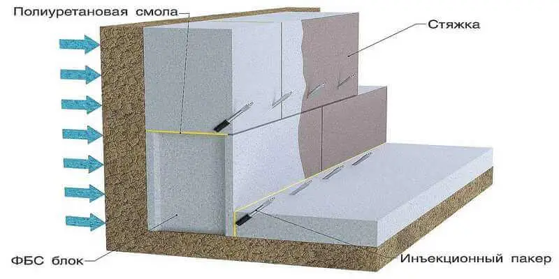 - Инъекционная. Это составы на основе одного или двух отверждаемых компонентов, которые наносят не на поверхность конструкции, а вводят в её тело посредством инъекционных паркеров. Весьма эффективная гидроизоляция, но и самая дорогая.
