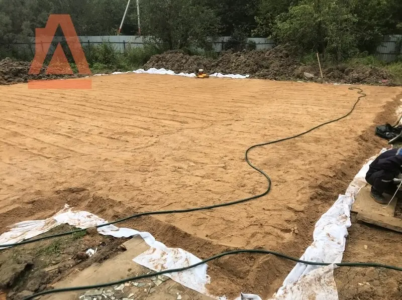 Подушка из песка устраивается практически на поверхности - При устройстве на пучинистых почвах с небольшим уровнем зимнего промерзания, пучинистый грунт по контуру плиты заменяют устойчивым к пучению материалом – песком, трамбуемым щебнем, или природной ПГС. При высокой вероятности промерзания грунта под плитой, кроме объёмных подсыпок может быть предусмотрен солидный слой пенополистирольной теплоизоляции.
