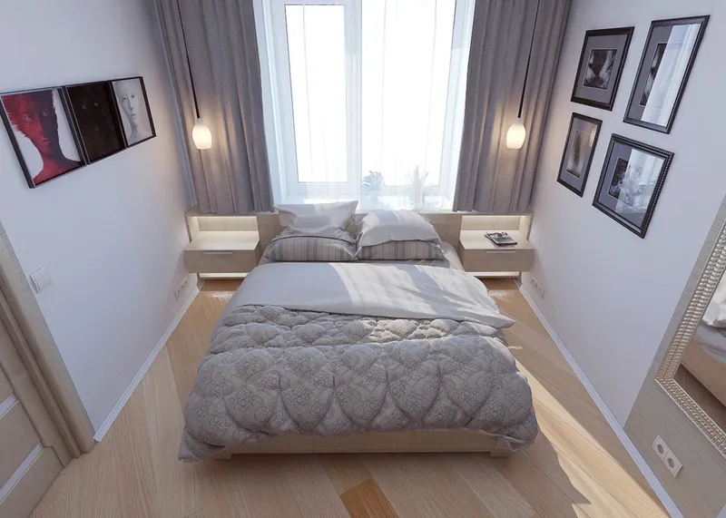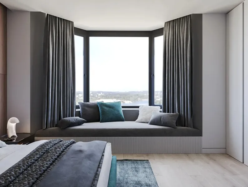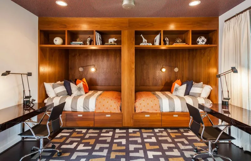 Вариант обустройства спальни с панорамным окошком - Спальни спроектированы таким образом, что их можно трансформировать под самые разные нужды – в зависимости от количества в семье детей и их возраста. Близнецам или погодкам, например, которые до определённых лет живут в одной комнате, может быть отдано под спальню самое большое помещение, с двухъярусной кроватью или двумя встроенными односпалками, парой столов и удобной игровой зоной.