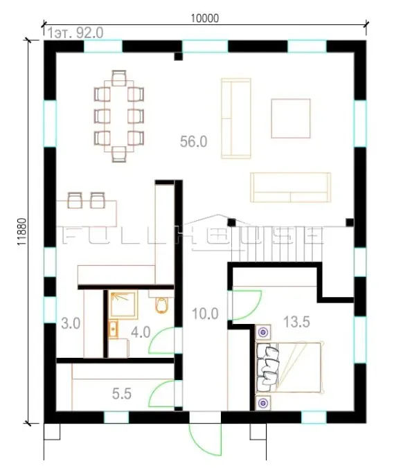 - Площадь гостиной-кухни составляет 54м², что эквивалентно по размеру средней двухкомнатной квартире. Может кому-то это и кажется излишним, но ведь дом рассчитан на семью из 5-6 человек, а в таком пространстве им тесно не будет. Размер помещения обусловлен габаритами необходимой мебели: большим обеденным столом, одним-двумя диванами и несколькими креслами в телевизионной зоне.