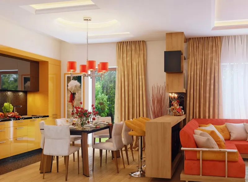- В основном, неприятие у людей объединённых помещений возникает из-за кухонных запахов, но покупка хорошей современной вытяжки, сколько бы она не стоила, всё равно оказывается более выгодной, чем конструкционное зонирование. В крайнем случае, отделить зону кухни от столовой можно стеклянной перегородкой или декоративной – не столько из-за запахов, сколько ради эстетики.