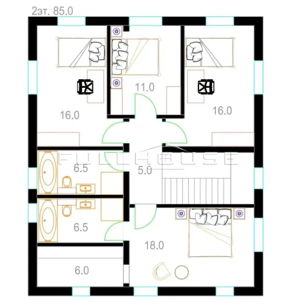 - На втором этаже находятся 4 спальни: две по 16м², одна 18м² (плюс 6м² гардеробная комната), и одна 11м². При правильном выборе мебели и её расстановке, даже на одиннадцати квадратах можно разместить и полуторную кровать, и большой шкаф, и стол с компьютером, и пару тумбочек или туалетный столик – так что, считать эту комнату маленькой нельзя.